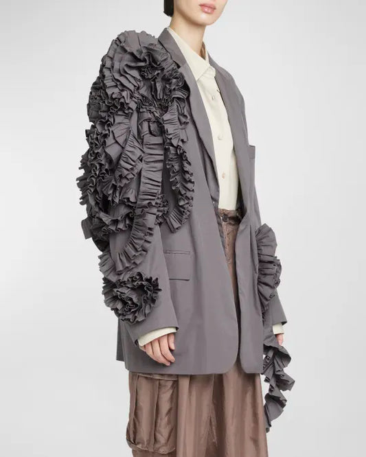 DRIES VAN NOTEN BLUR BLAZER JACKET WITH RUFFLE DETAIL IN GREY, SMALL