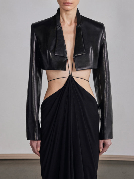 GRACE LING CROPPED LEATHER BLAZER WITH SLENDER LAPELS - BLACK, FR34