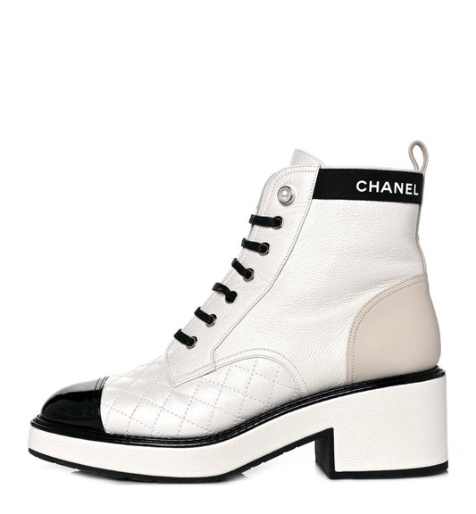 CHANEL 2021 Pearly Calfskin Patent Calfskin Quilted Lace Up Boots Women's Size 39, US 8.5