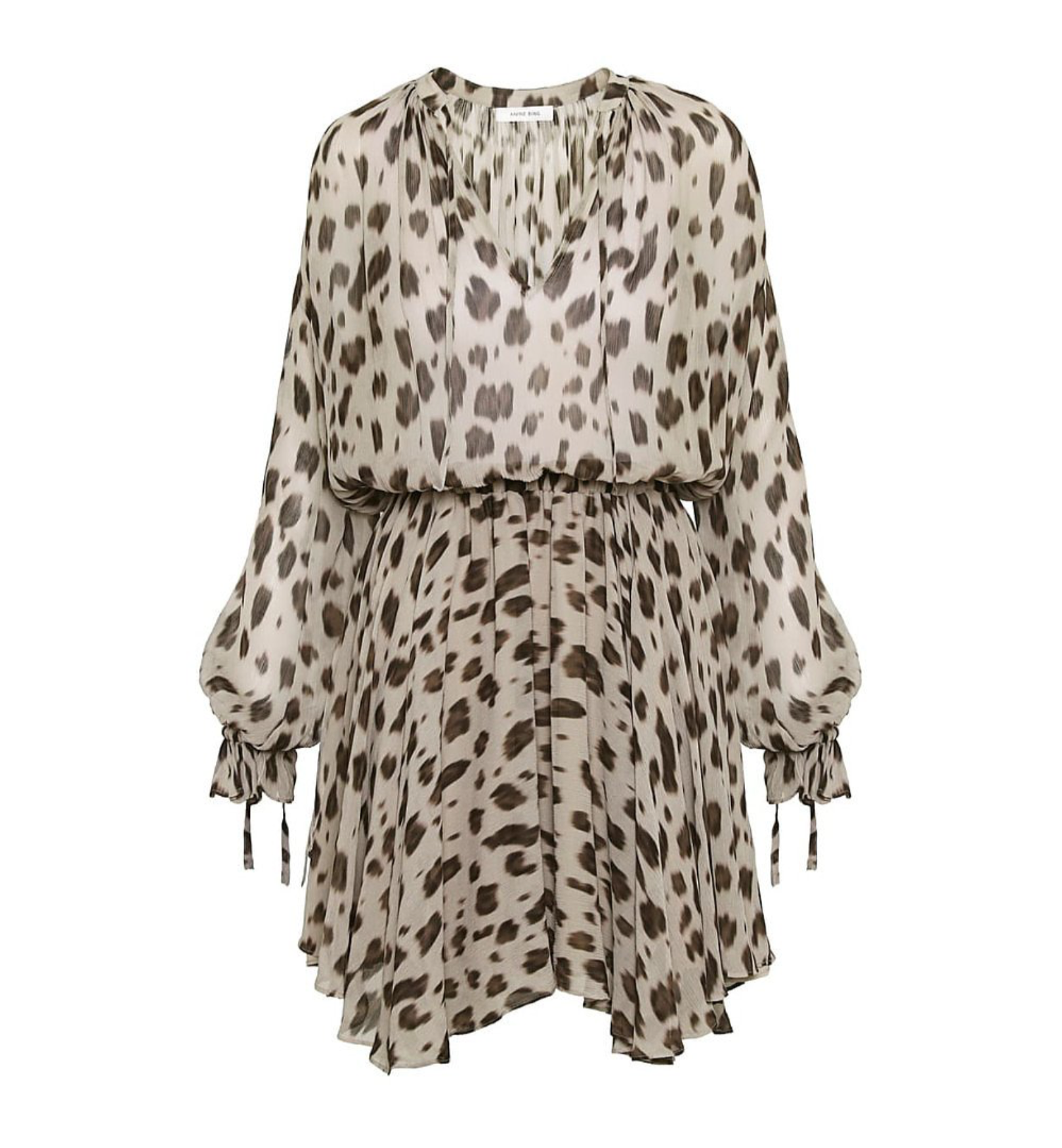 Anine Bing Beige and Brown Silk Elliana Leopard Print Long Sleeve Semi-Sheer Mini Dress with Elasticized Waist and Arm Cuffs,