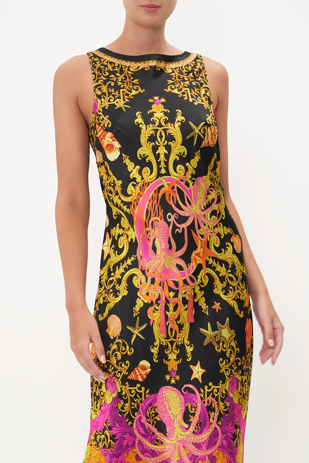 Underwater majesty leaving us enthralled, the Octopia Bias Slip With Draped Back blends a rich midnight hue defined by gold baroque cascades, vibrant octopus wrapped in neon-dipped fuchsias and ornaments of the sea glittering amongst it all. Adorning hand-embellished CAMILLA crystals, this luxury silk slip dress features a high neckline, an on-the-bias silhouette, draped back details, gold hardware and a relaxed slimline fit that hugs your curves.