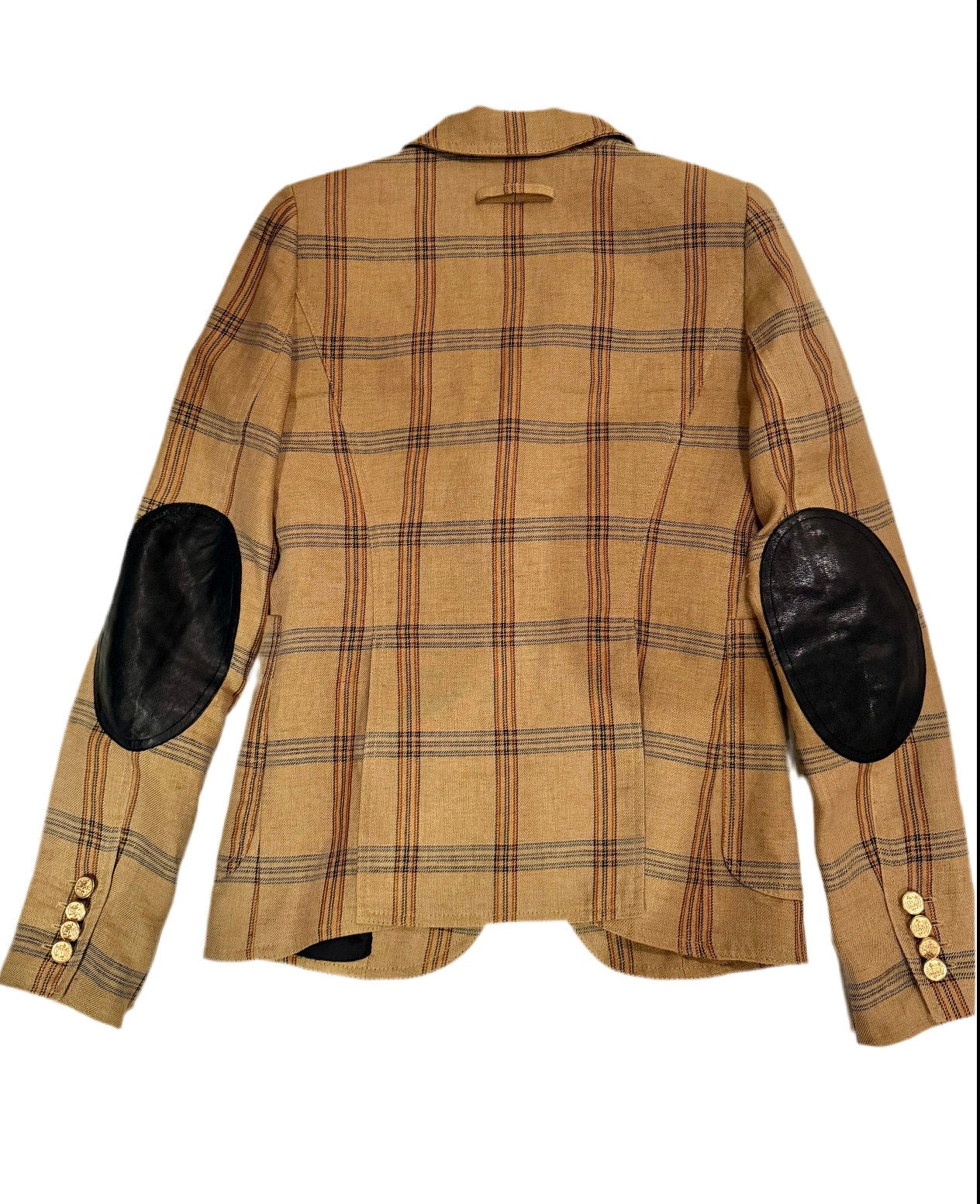 Made in Canada, this single-breasted Duchess blazer from Smythe circa 2019 is crafted with a woven linen in a tan Burlap Plaid, and is decorated with structured seaming and embossed goldtone hardware. It features long sleeves, black leather elbow patches, buttoned cuffs, padded shoulders, peaked notch lapels with buttonhole detailing, a single button closure, a chest welt pocket, front patch pockets, a round front hem, a double-vented back, and is lined in a black satin.