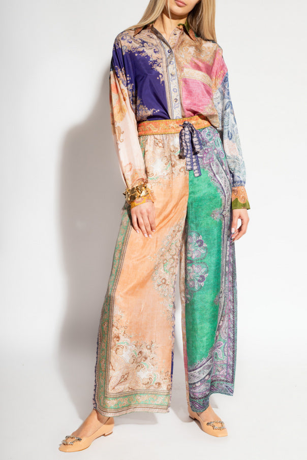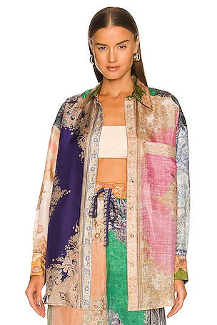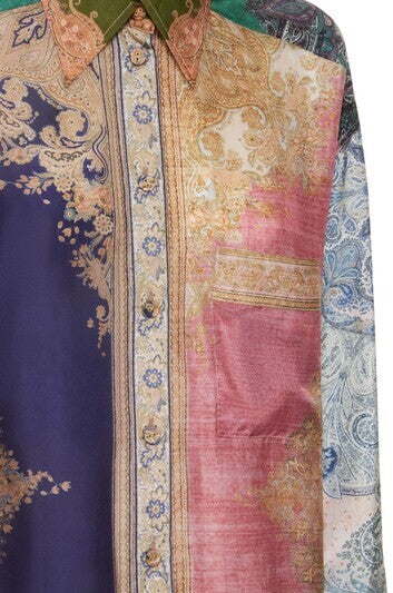 The Anneke Relaxed Shirt in Patch Paisley from our Summer Swim 2022 Collection. A silk habotai shirt featuring a classic collar and centre front button closure. Silk habotai oversized classic shirt silhouette, self cover buttons at centre front and cuffs, chest patch pocket, classic collar. The Anneke Draw Waist Pants in Patch Paisley from our Summer Swim 2022 Collection. A silk habotai wide leg pant featuring a draw string elasticated waist band. Silk habotai high waisted, wide leg pants side seam pockets.