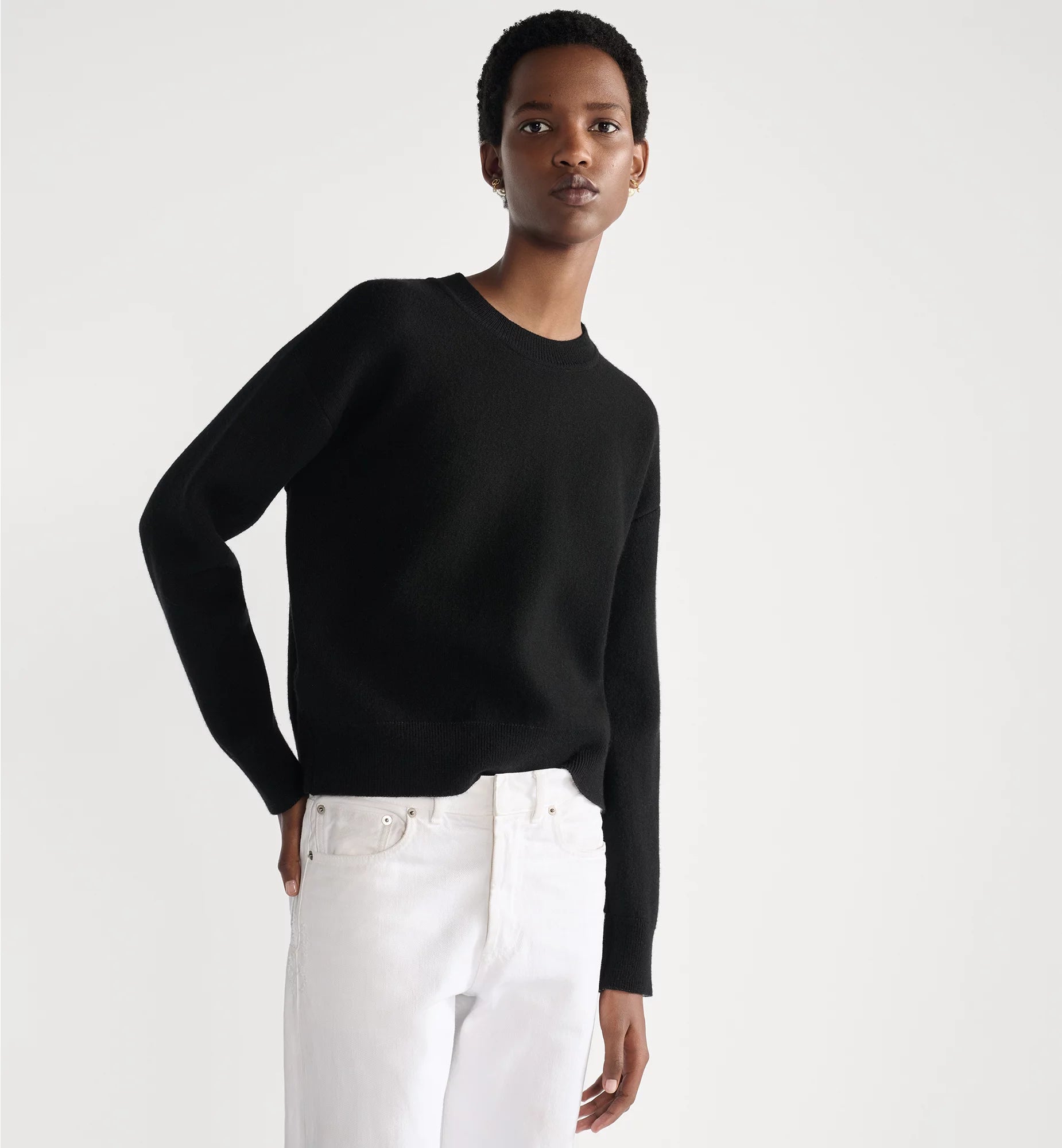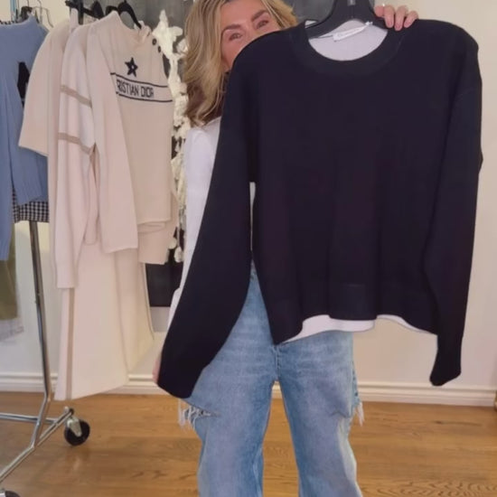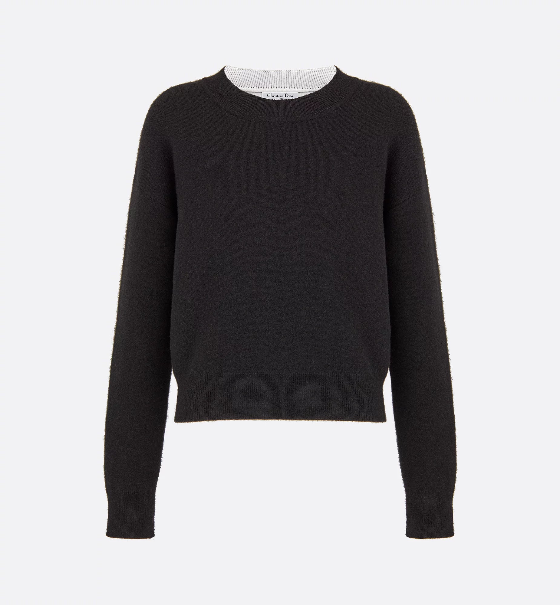 The black boxy cashmere sweater references Christian Dior's lucky number. J'Adior 8 lettering in white jacquard highlights the back, and the ribbed hem and cuff showcase a classic athletic look. The crew neck sweater pairs easily with a tulle skirt for a timeless look.