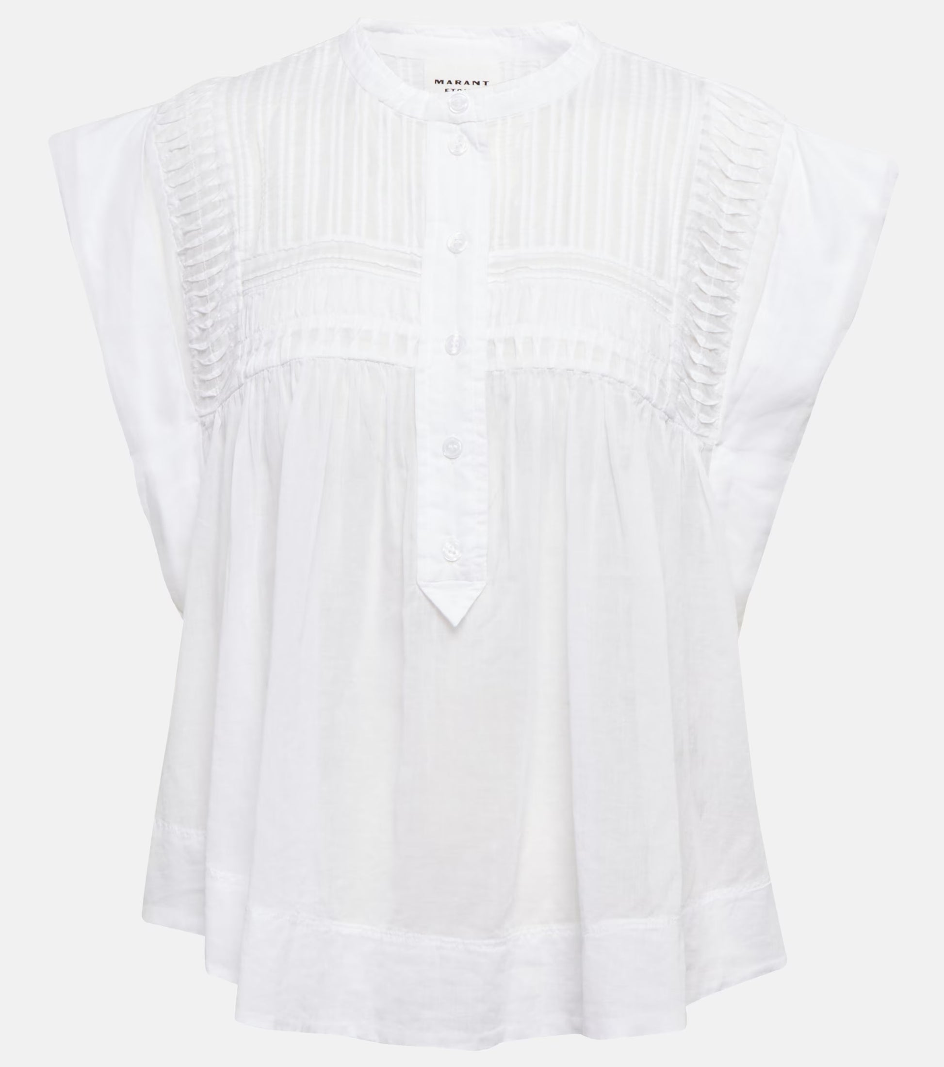 Exuding a filmy bohemian charm, this fluttering top is crafted from light-as-air cotton voile. It is detailed with delicate pleating at the bib to enhance its easy shape, while a banded collar, crisp cap sleeves and a buttoned placket lend a tailored touch.
