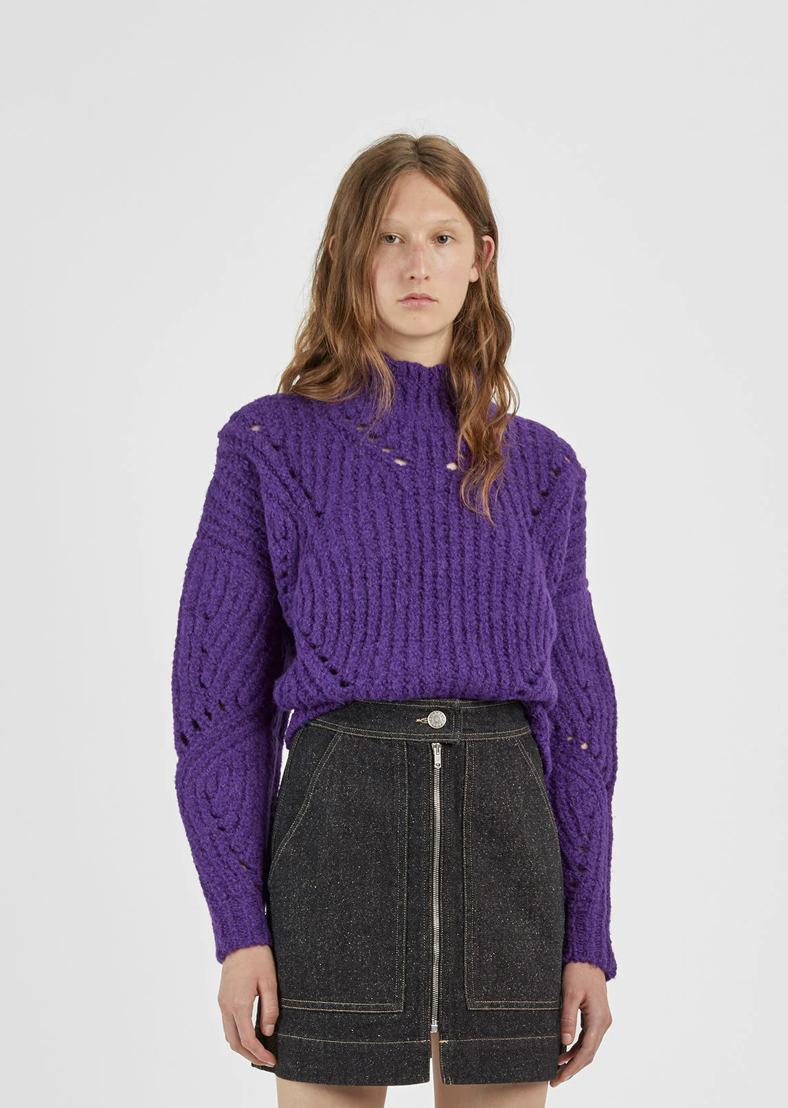 Purple turtleneck pullover knit in a soft blend of wool and alpaca with subtly perforated detailing at the front. Slightly cropped, oversized fit. Dropped shoulders. Oversized, billowing sleeves. Color: Purple. 75% Wool, 24% Alpaca, 1% Polyester. Made in Italy.