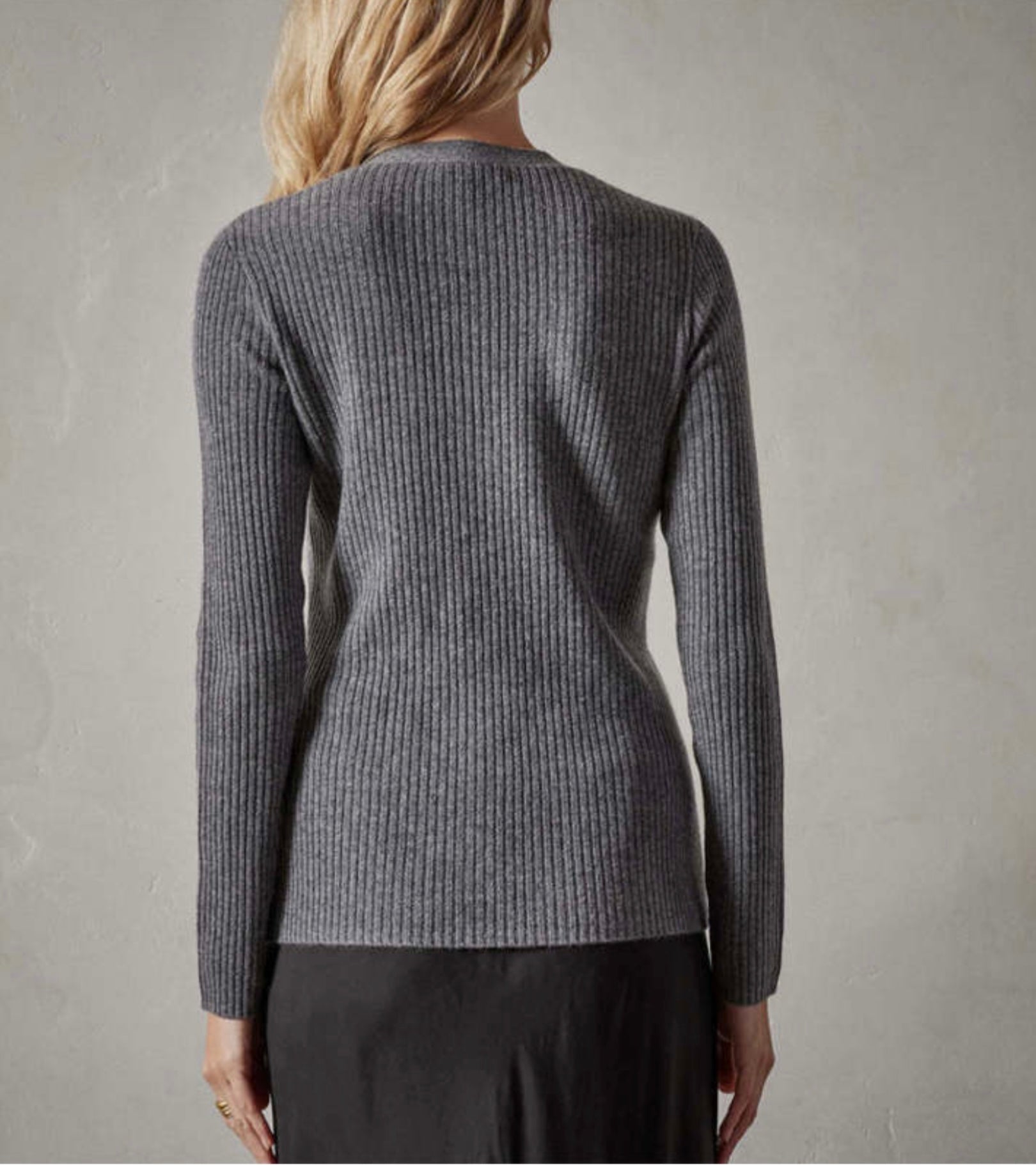 The Skinny Rib V Neck Sweater is made from recycled cashmere fibers. Style details include an all over rib stitch, binded v neckline and self start hems. - 100% Recycled Cashmere - Length: 25" - Dry Clean Only - FIT TIP