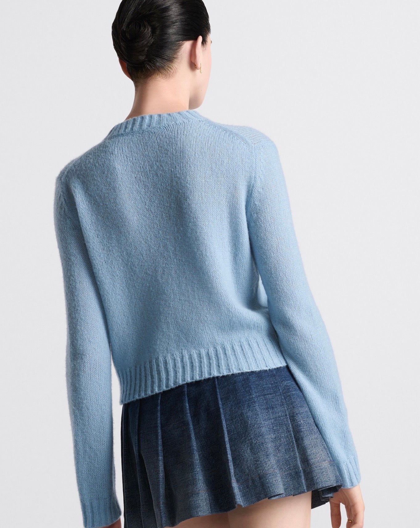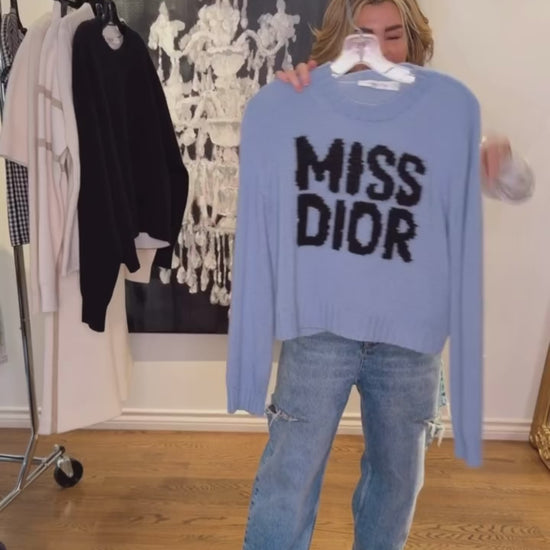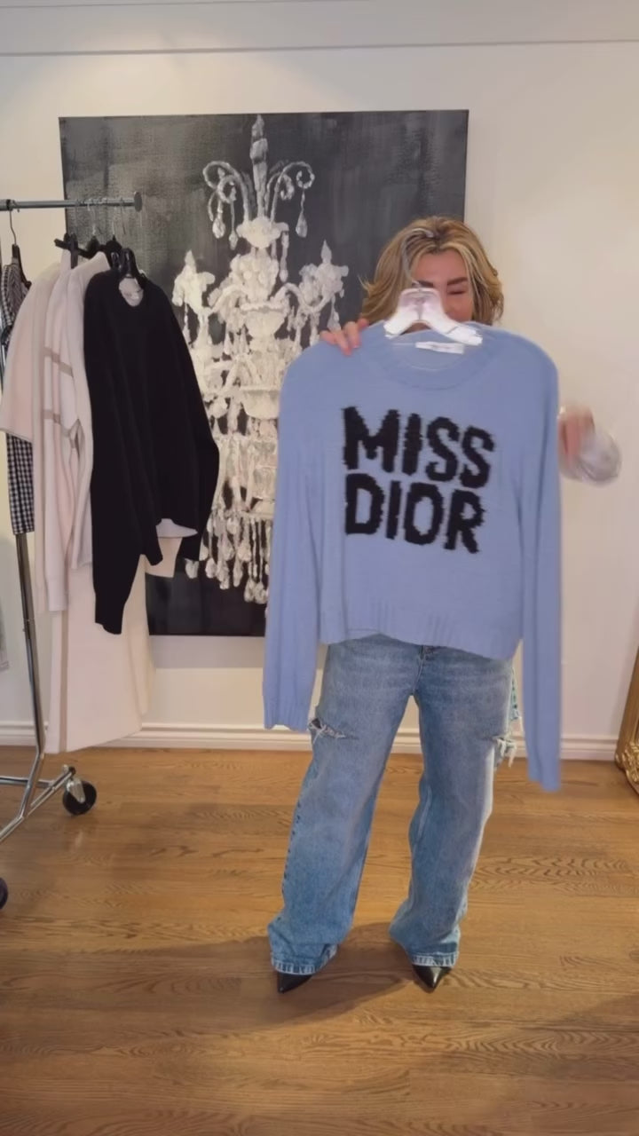 The sweater features the black Miss Dior Graffiti motif, a nod to the 1967 debut ready-to-wear collection and a manifesto to Maria Grazia Chiuri's signature celebration of feminism. Crafted in a pale blue cashmere and silk knit, it has a ribbed hem and cuffs. The round-neck sweater can be worn with casual outfits in any season and will coordinate well with other Miss Dior Graffiti creations. - Ribbed collar, hem and cuffs - 78% cashmere, 22% silk (7 gauge)* - Made in Italy - Treat with extra care and gently dry clean