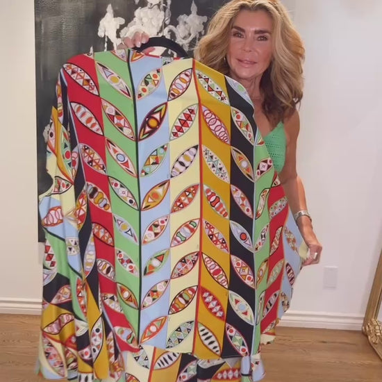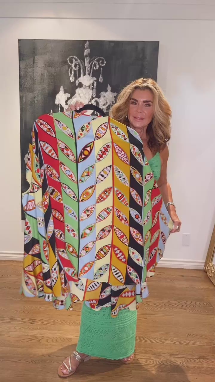 A PUCCI classic, this Girandole-print mini dress is cut like a caftan to show a lot of leg. The flowing silk adds an airy quality to the look.