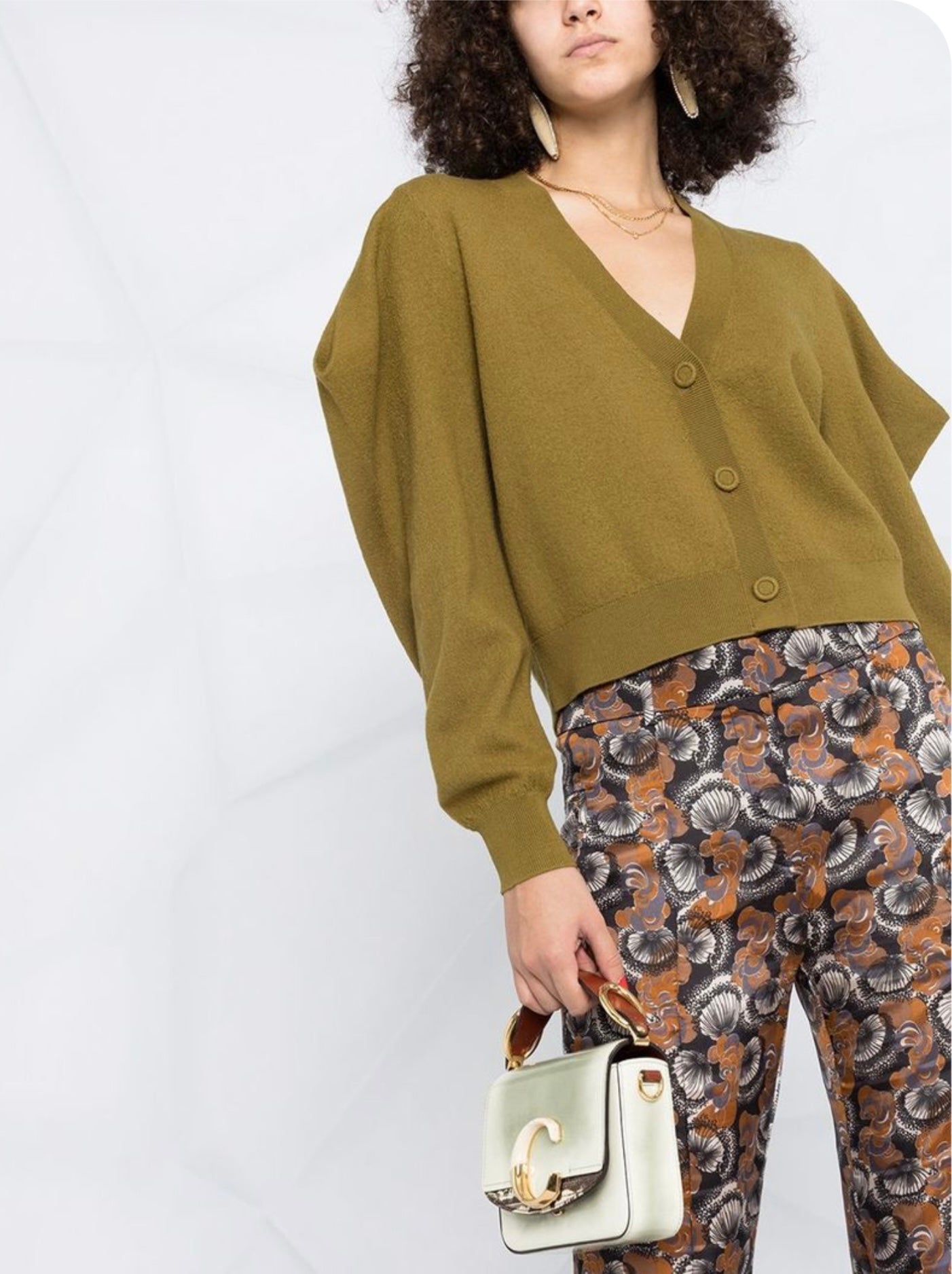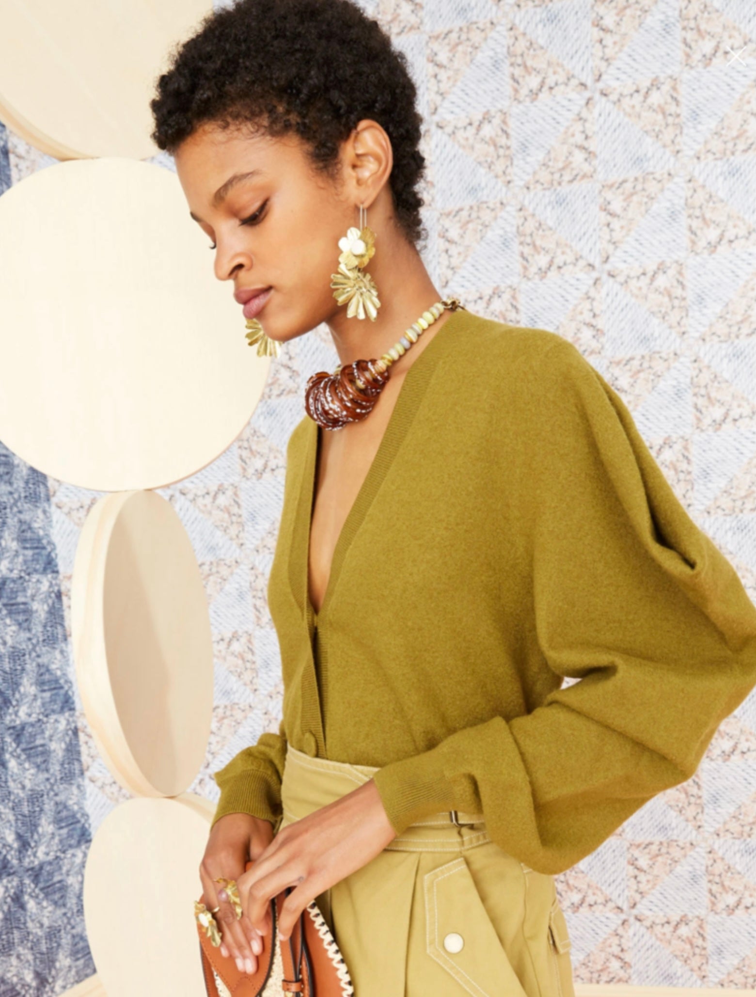 As seen in look #27 of Resort 2021 \ the Dune Trouser in Fennel Seed. Th crafted from our ever evolving boiler shade of earthy green. An easy to wi sculptural and feminine sleeves mak statement piece.
