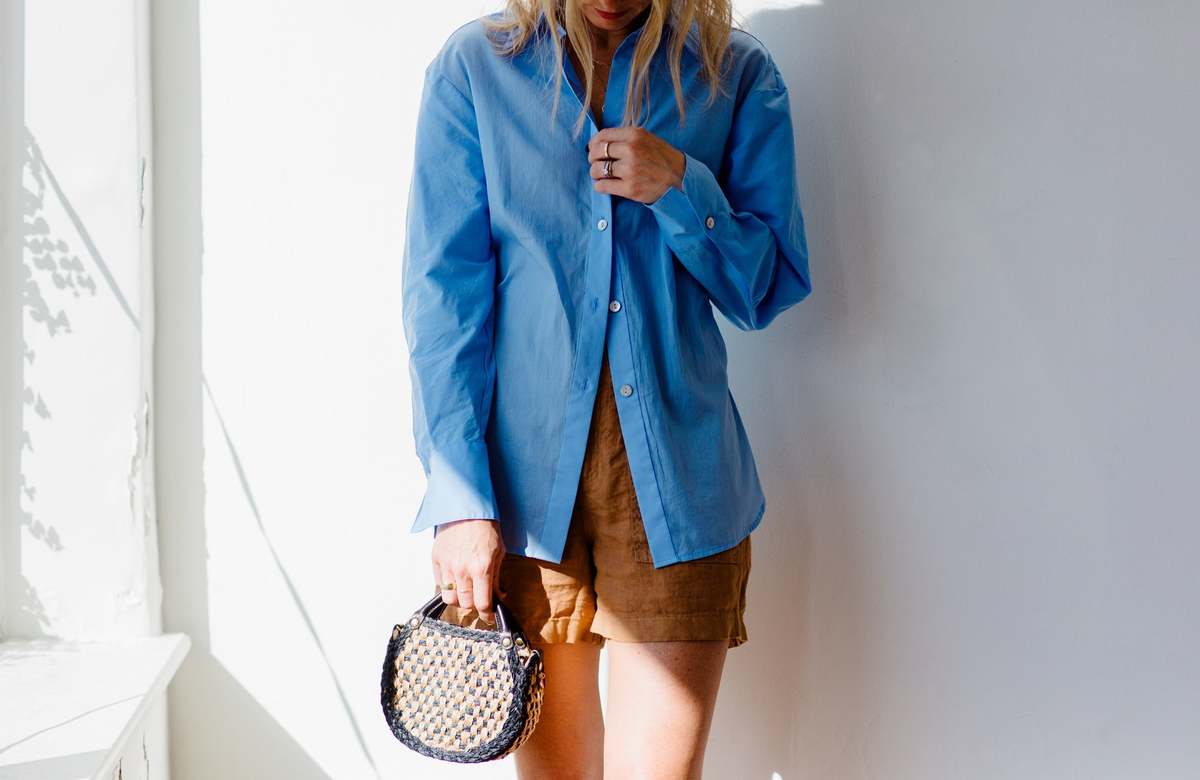 This blouse by Vince features a button front with a tailored fit. Fit: This top runs true to size. Care: Dry Clean Only Fabrication: 100% Cotton Color: Cerulean Origin: Imported